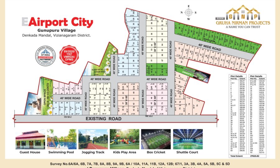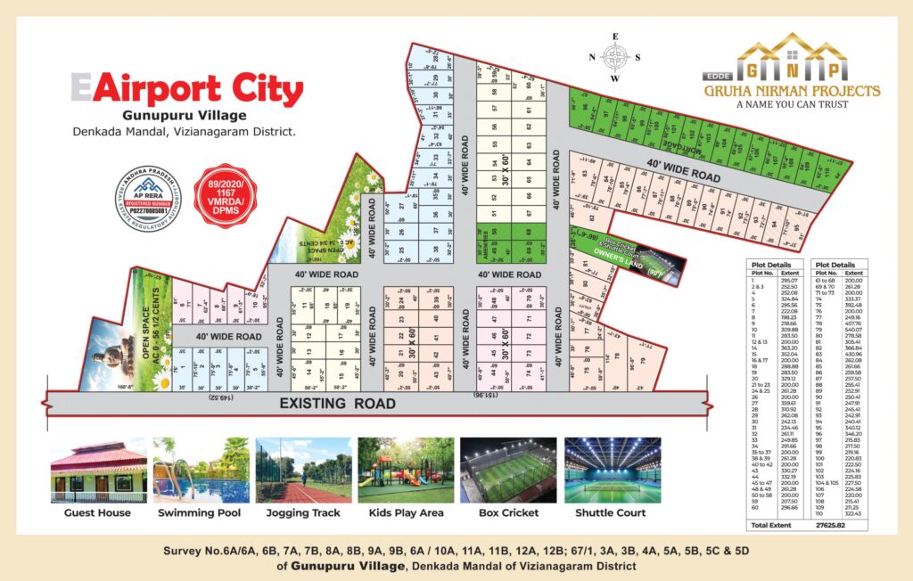 Discover premium open plots at Airport City, Gunupuru Village, strategically located near the upcoming Bhogapuram International Airport in Vizianagaram. Developed by Gruha Nirman Projects, this gated community offers DTCP & RERA-approved layouts with world-class amenities including 40 ft roads, avenue plantations, underground electricity, parks, and a grand entrance arch.