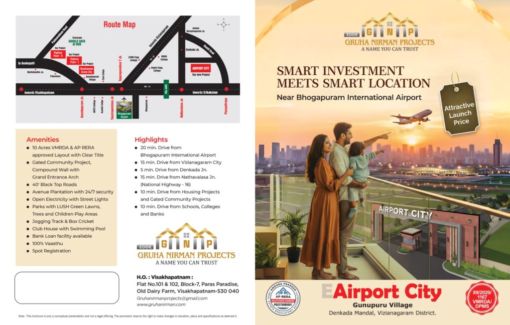 Airport City is a premium residential plotted development located in Gunupuru Village, Denkada Mandal, Vizianagaram District, strategically positioned near the upcoming Bhogapuram International Airport. Developed by Gruha Nirman Projects, this project offers an excellent opportunity for both investment and future residential living.